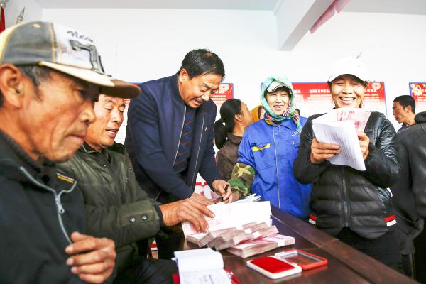 10时,随着村党总支书记房廷军宣布大会开始,寂静的会场霎时间热闹了起来。贫困户们拿着“台吉君华农业专业种植合作社”的会员证,按着顺序依次走上前台签字、领钱……面对每人1000元的“分红”,人们喜悦的心情溢于言表。