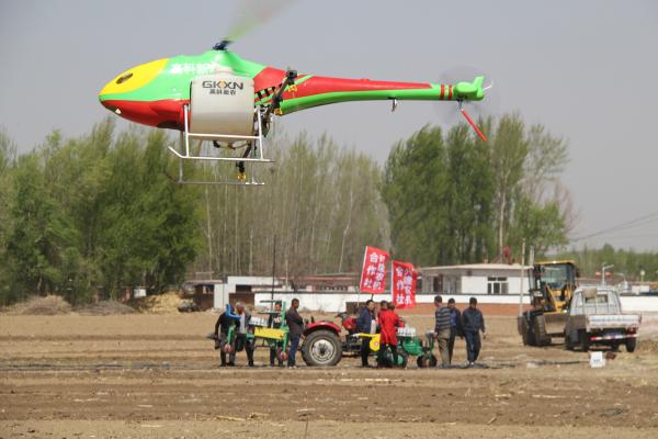 一架无人植保机,装载着农药和化肥,按照设定好的路线和区域内来回穿梭,进行喷洒。