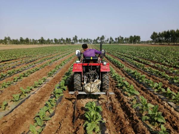 烟农正在为烟叶追肥除草起垅。